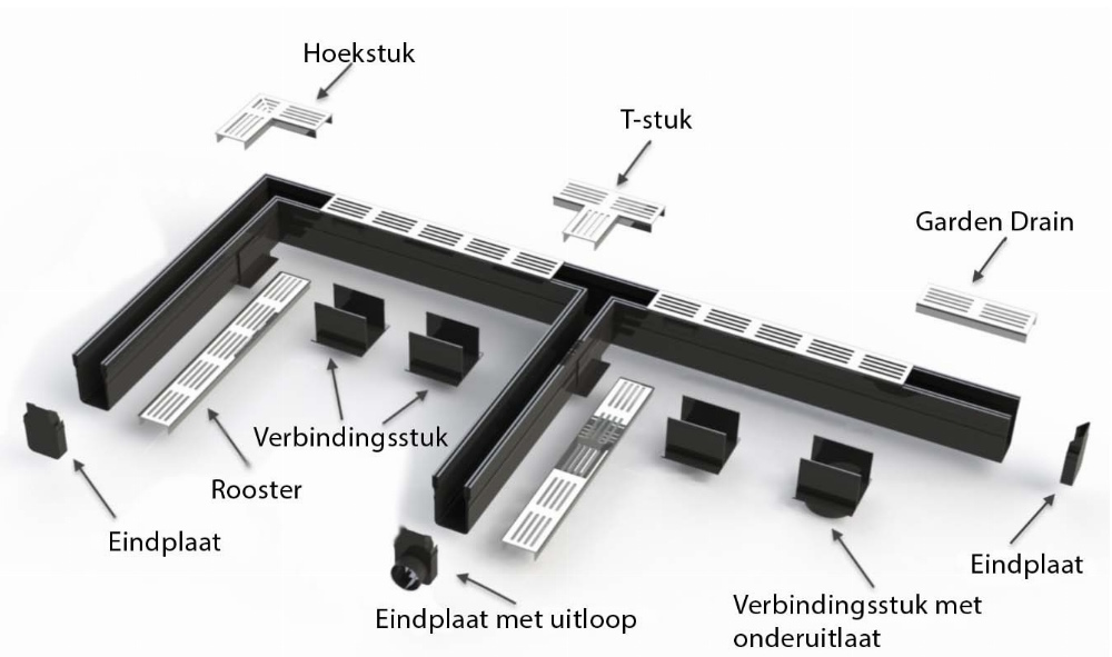 De Garden Drain is verkrijgbaar in verschillende verbindingsstukken, koppelstukken en hoekstukken. De serie is verkrijgbaar in grijs aluminium, zwart aluminium en cortenstaal. Het is alleen geschikt voor loopverkeer en niet voor opritten.