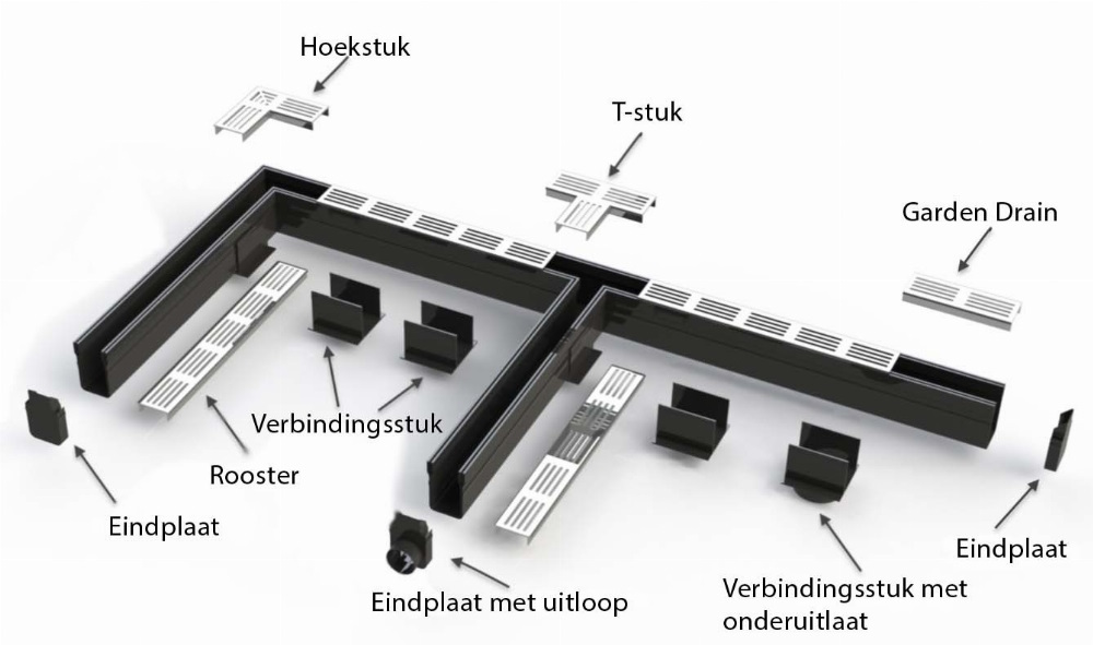 De Garden Drain is verkrijgbaar in verschillende verbindingsstukken, koppelstukken en hoekstukken. De serie is verkrijgbaar in grijs aluminium, zwart aluminium en cortenstaal. Het is alleen geschikt voor loopverkeer en niet voor opritten.