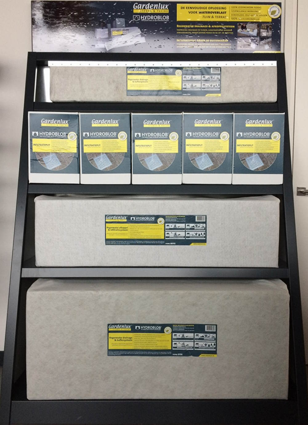 Hydroblob 120x30x100cm D340. De Hydroblob D340 worden toegepast als drainage- en waterbuffering rondom gebouwen, verhardingen en in tuinen. De Hydroblob D340 is de belastbaarheid 2500 kg/m² en heeft het een inhoudscapaciteit van 340 L. Een verticale vezelrichting bevordert een bufferende- en infiltrerende functie, hierbij worden de blokken staand geplaatst (de sticker this side up zit boven). Maar een horizontale vezelrichting bevordert juist een drainerende functie, de sticker zit dan juist aan de zijkant.