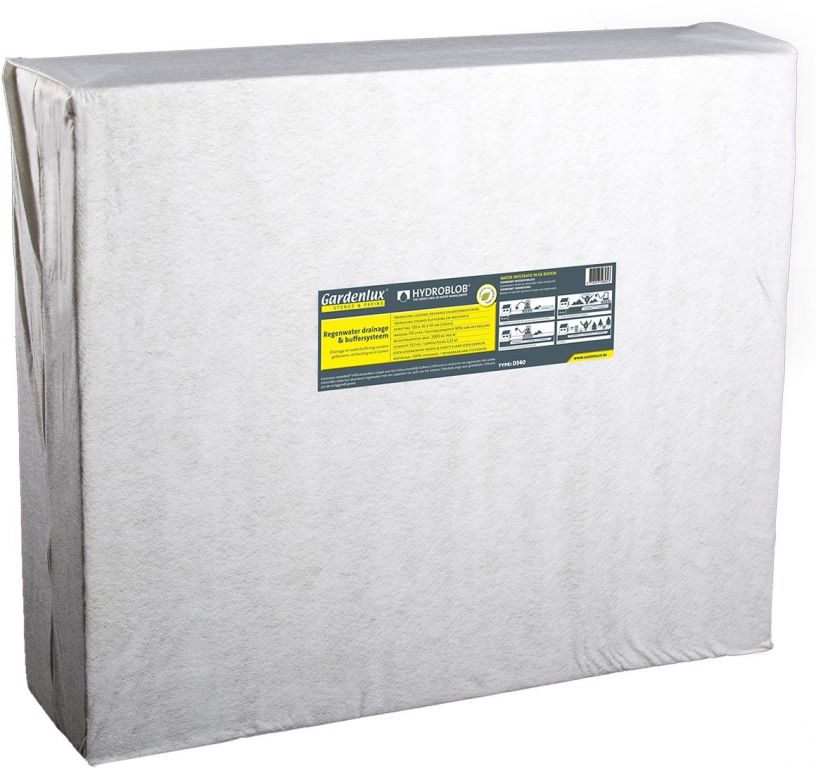 Gardenlux Hydroblob drainageblokken zijn gemaakt van steenwol, een 100% natuurlijk materiaal op basis van basalt. Het is bijzonder sterk en bestand tegen erosie door plant- en boomwortels. De blokken zijn omwikkeld met een filterdoek dat instroming van zand en grond voorkomt. Het unieke natuurlijke materiaal absorbeert regenwater bijzonder snel en zorgt voor een geleidelijke infiltratie van het water in de bodem rond het blok. Zo wordt het grondwater op natuurlijke wijze aangevuld. Verdroging wordt voorkomen.